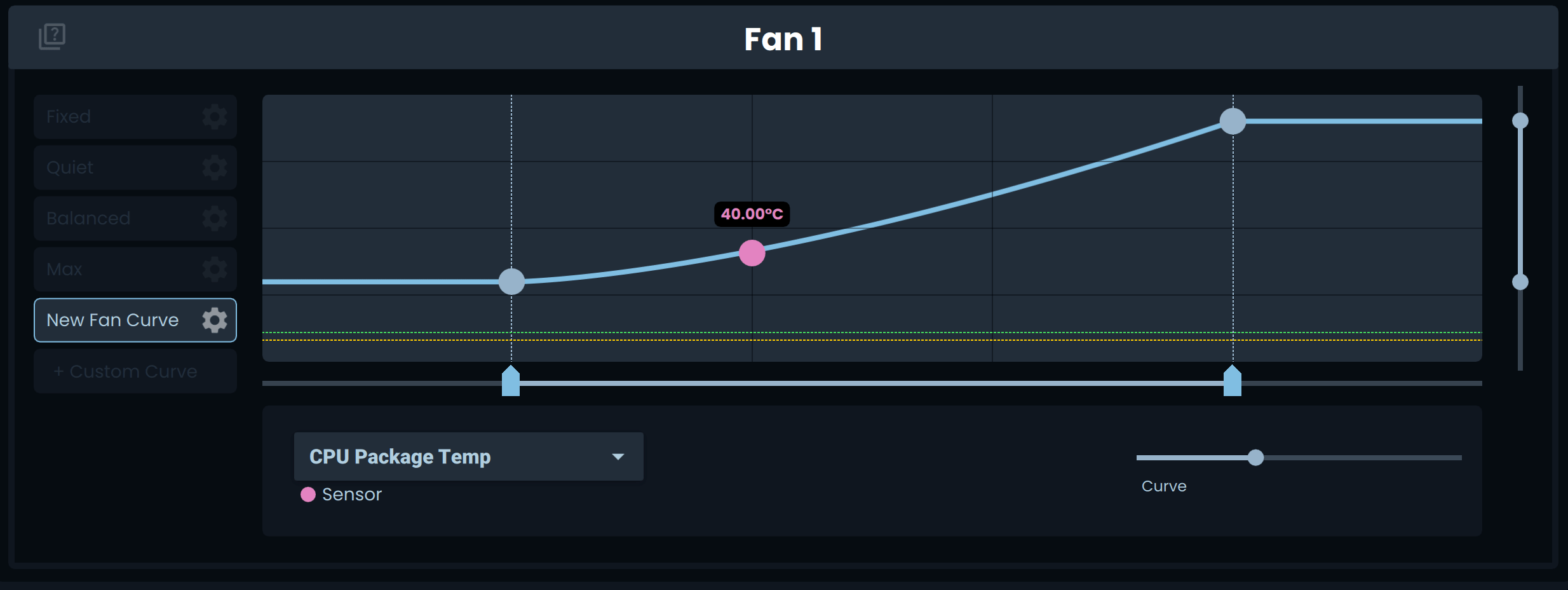 Section titled “Creating Custom Fan Curves”If you would like to customize how your fans behave, you can create custom fan curves. These allow you to define the temperature thresholds required to reach certain fan speeds.