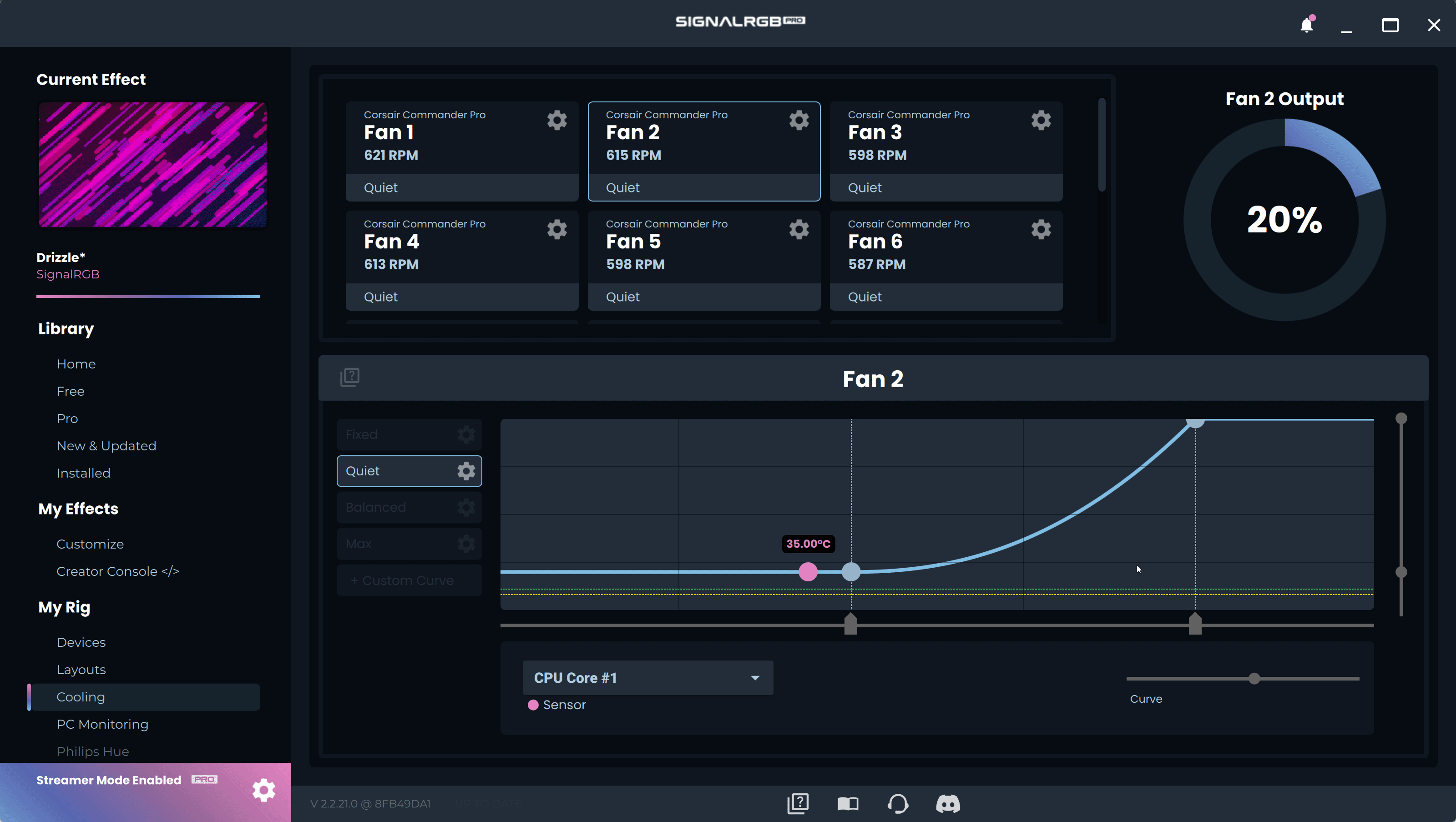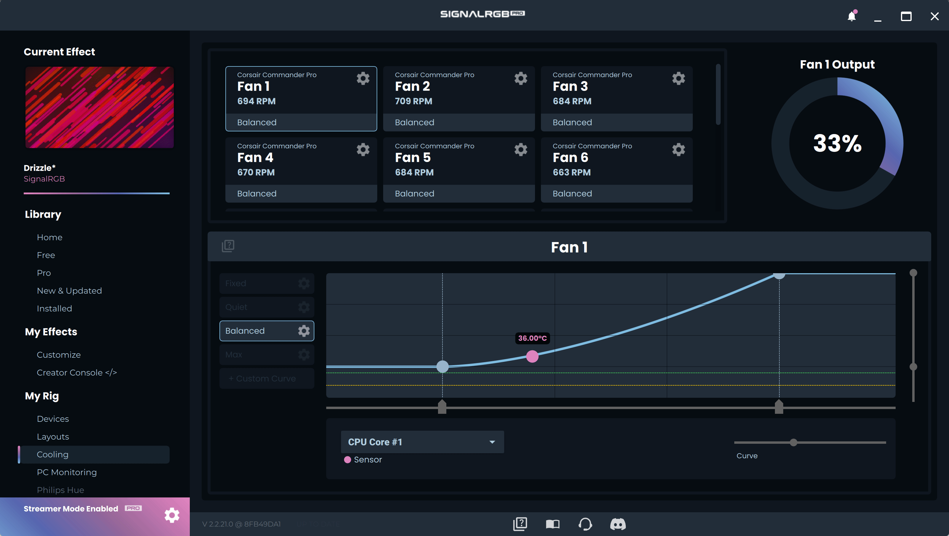 Cooling is a SignalRGB Pro exclusive feature that allows users with supported fan controllers to control their fan speeds. You can set fan speeds on a per-fan basis and can make your own fan curves to customize the cooling and performance of your system.
