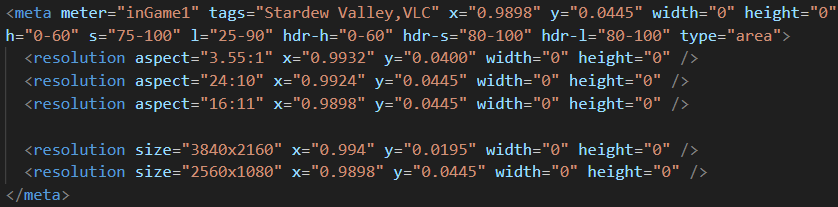 All adjustments must be placed between the opening <meta> and closing </meta> tags; otherwise, they won’t work. If your default meter is based on 16:9 and behaves consistently across those resolutions, you don’t need to add adjustments for other 16:9 resolutions. However, you must add entries for every resolution in other aspect ratios (such as 16:10 and 21:9), even if the ratio is consistent.
