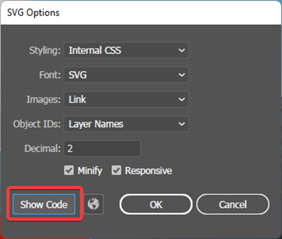 In the next window that opens, ensure that Image is set to Link, and then click the Show Code option.