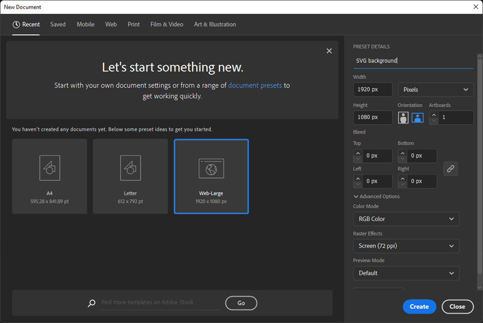 SVG paths can be created relatively easily using Adobe Illustrator. It is best to start with a regular PNG image that you wish to simplify into an SVG path. Once you have found a background image, create a new Illustrator project by clicking New and choosing the Web Large preset.