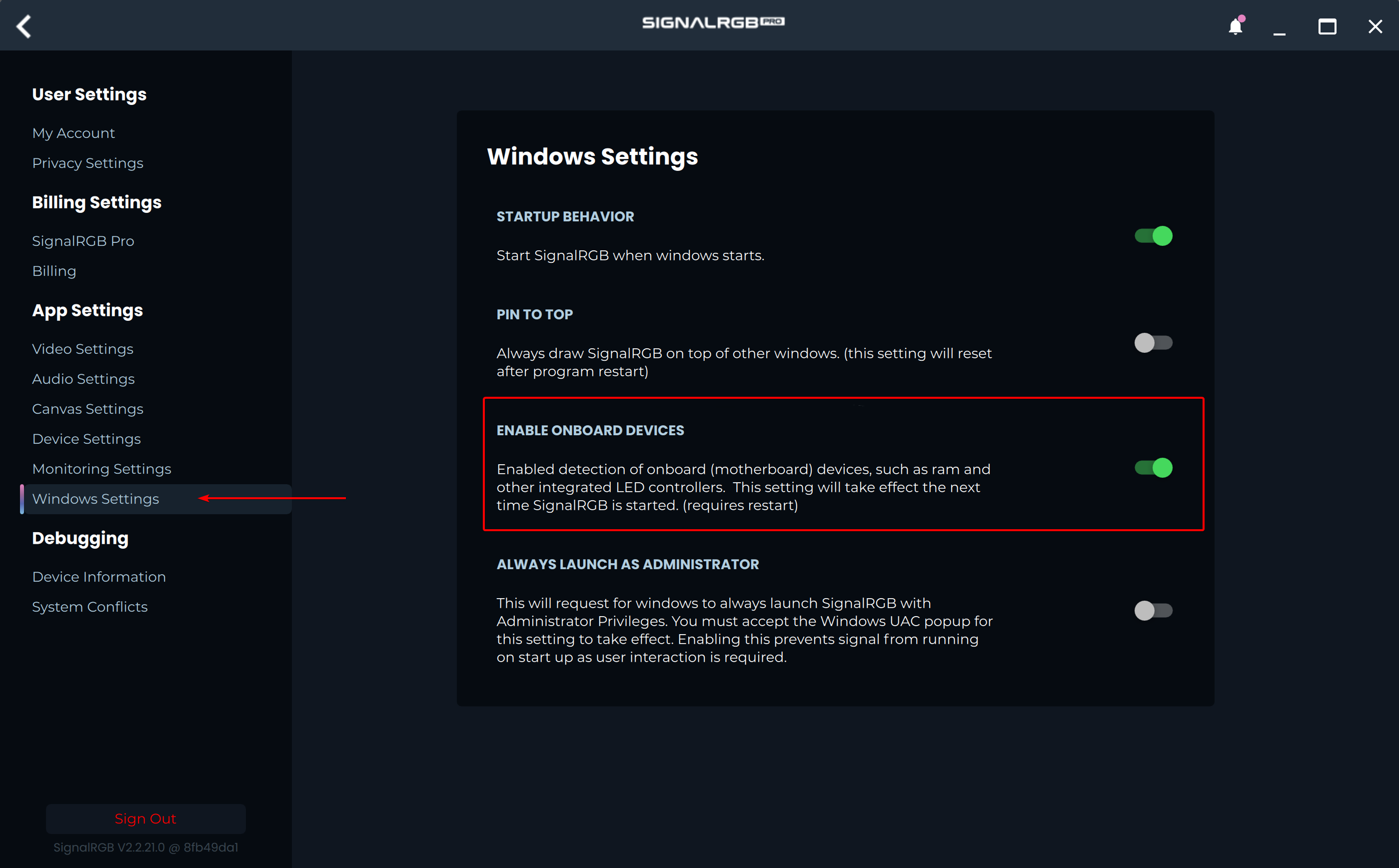 - In SignalRGB, click on the Settings icon, choose the Windows Settings page, and ensure “Enable Onboard Devices” is turned on.
