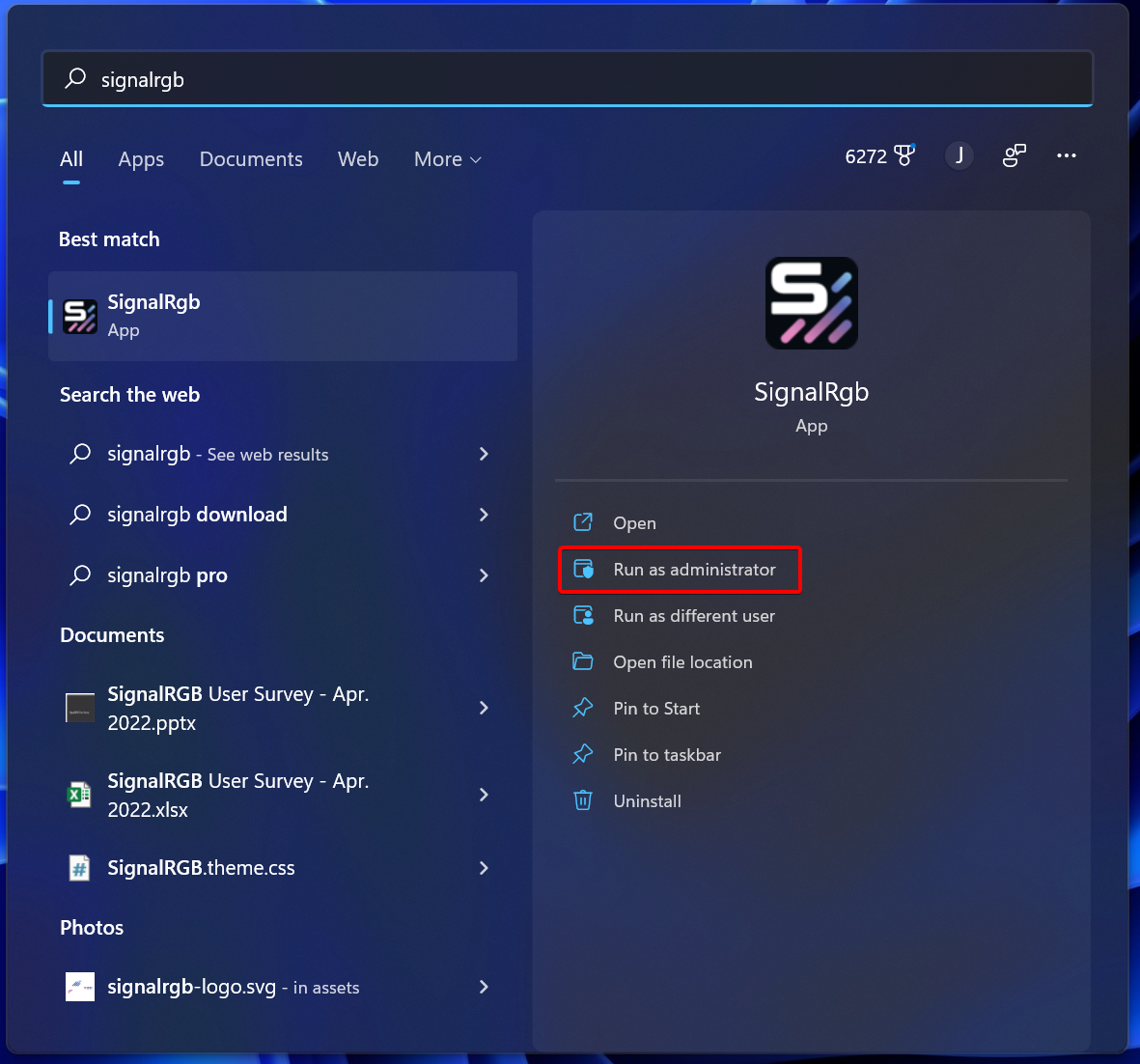 - Search for SignalRGB in the start menu, then right click on the app and choose Run as Administrator.