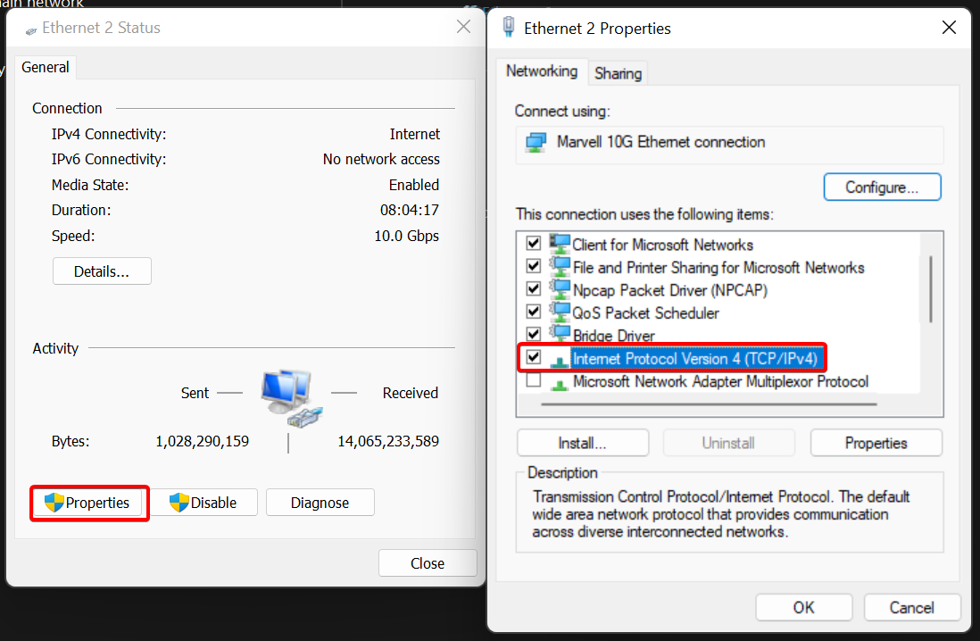 Click on your network adapter and select Properties . Then, ensure the box next to Internet Protocol Version 4 is checked.