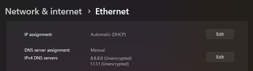 Section titled “DNS Issues”Some ISPs have issues resolving our hostname, or maybe a bad route is blocking access to our host, a way to prevent that is using Google DNS or Cloudflare DNS: