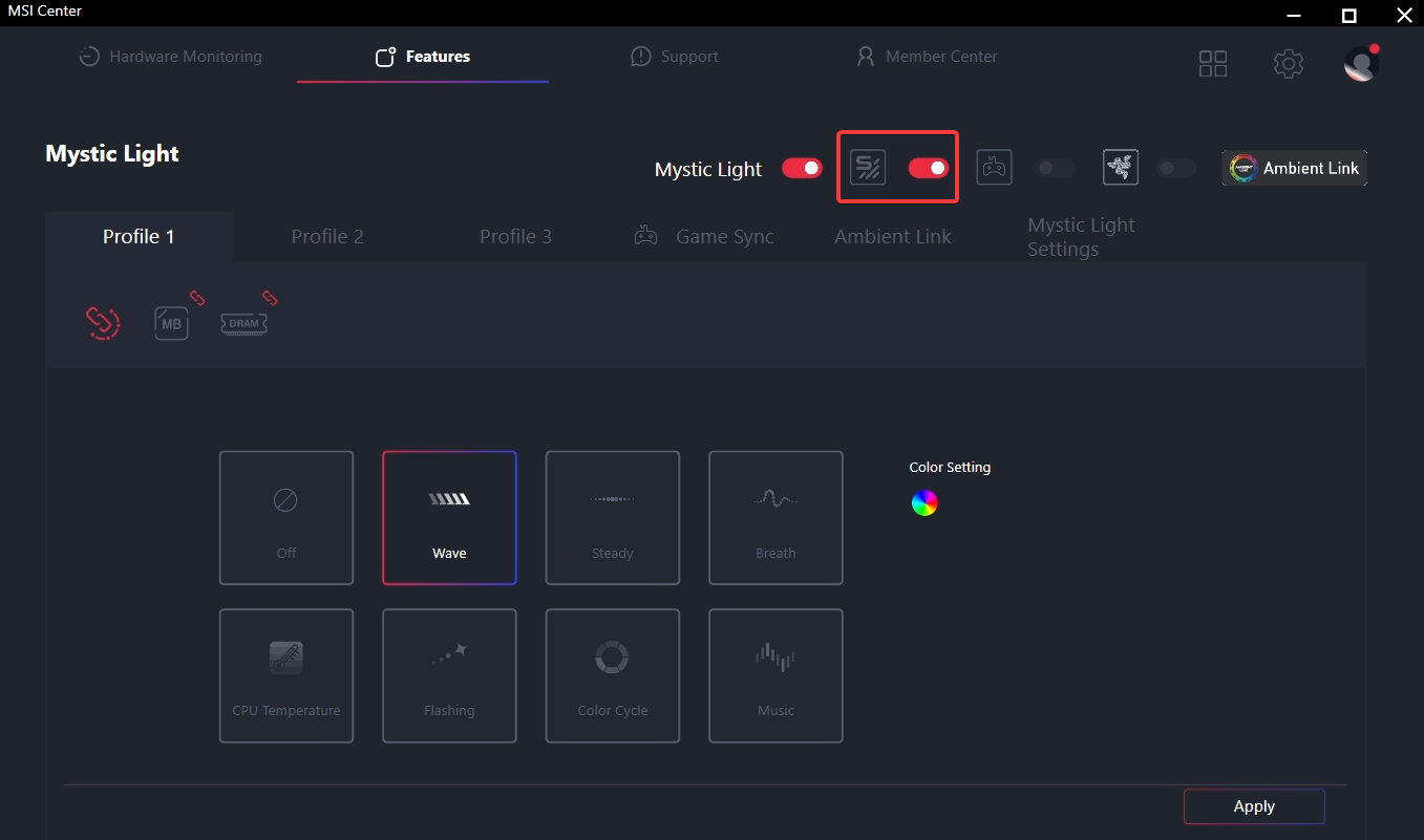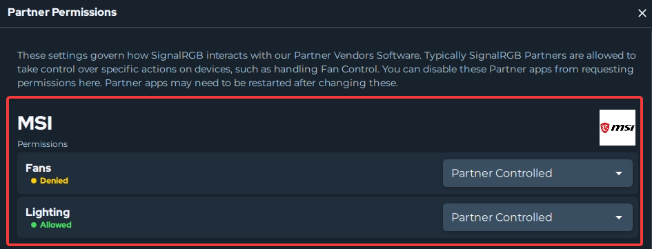 If you have “Partner Controlled” set, the Mystic Light will control those. From the Mystic Light app, you can select when Mystic Light or SignalRGB will control from the SignalRGB toggle: