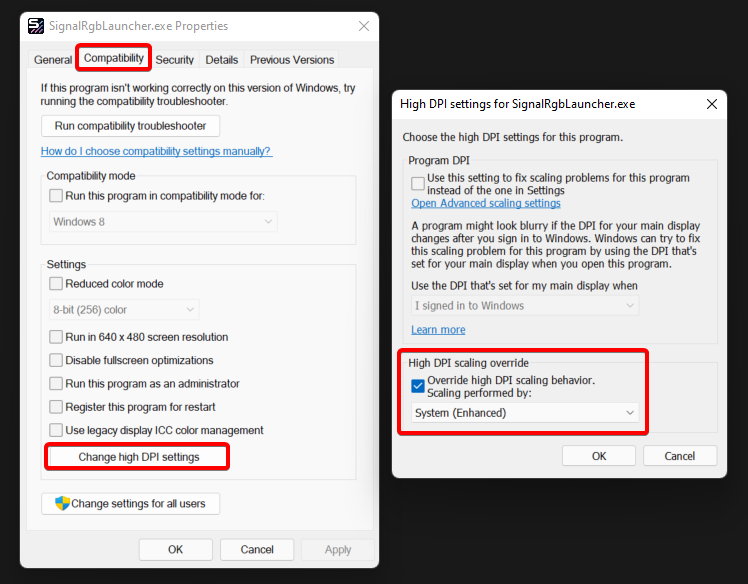 One way to fix this is to override the scaling for SignalRGB. To do this, first browse to %localappdata%\VortxEngine. Then right-click SignalRGBLauncher.exe and choose Properties. Go to the Compatibility tab and press the Change high DPI Settings button. In the popup window that opens, click the Override High DPI Scaling Behavior box and select System (Enhanced) in the dropdown. Click Ok to close the popup, then Apply in the first window to apply the settings.