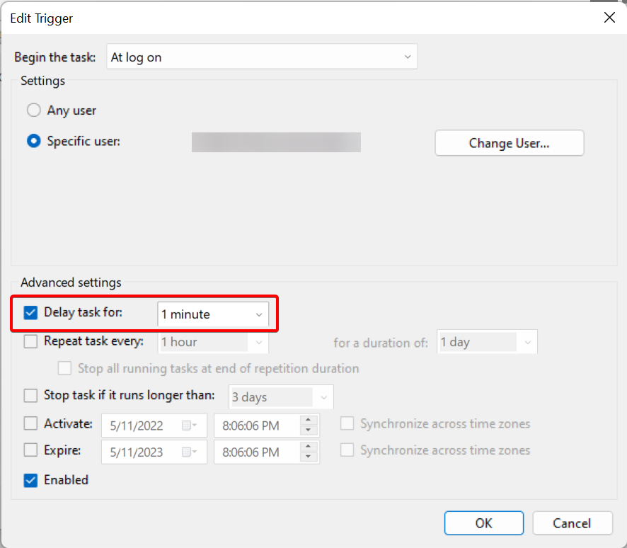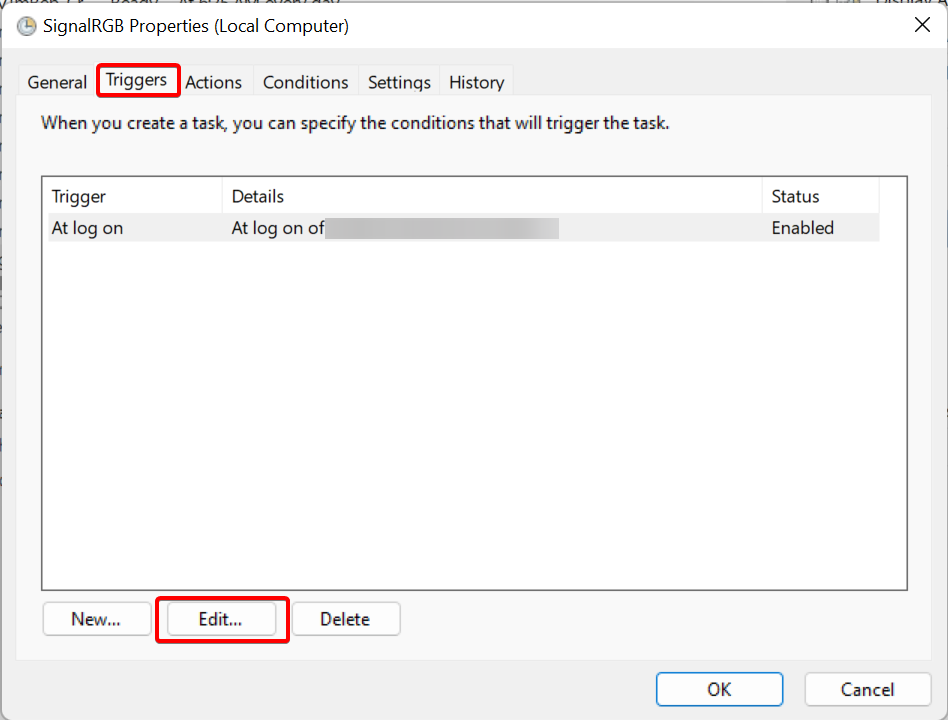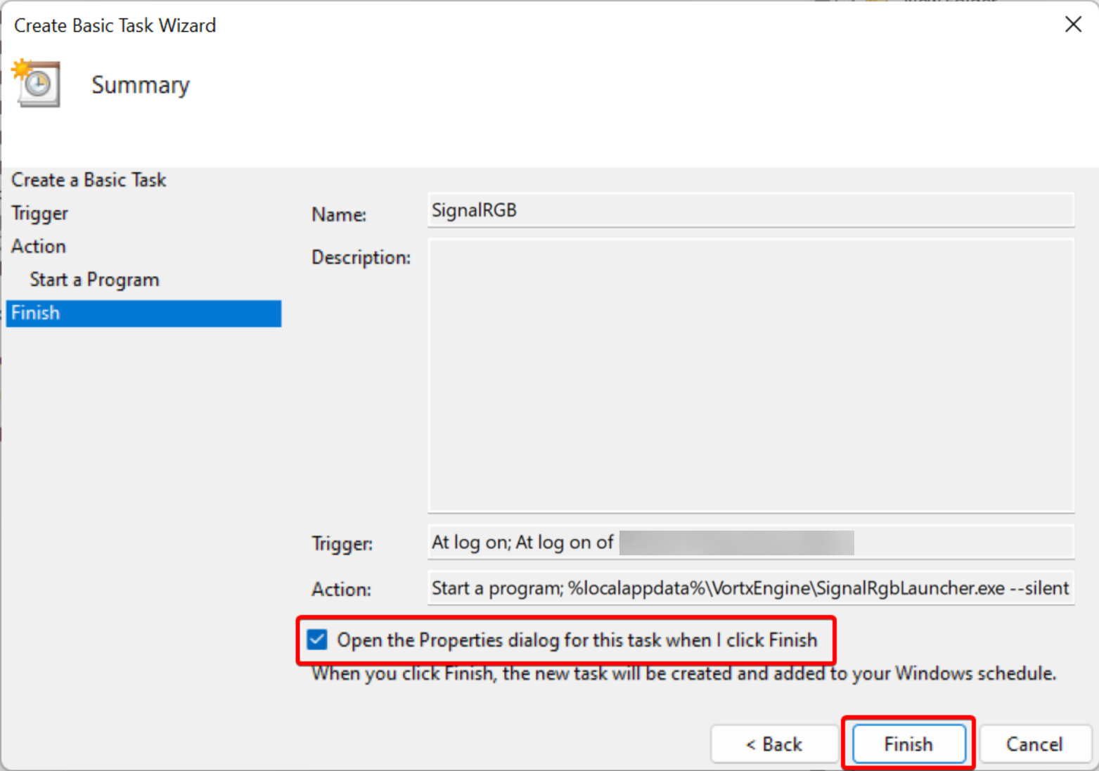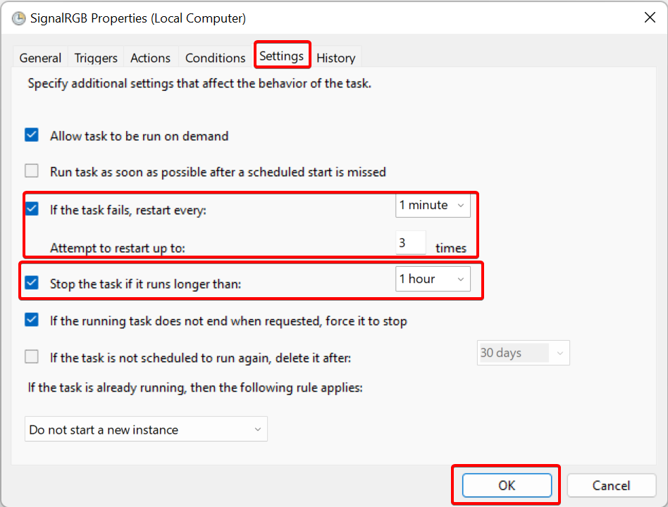 - Click OK and close the Task Scheduler window. SignalRGB should now start automatically after a 1 minute delay.