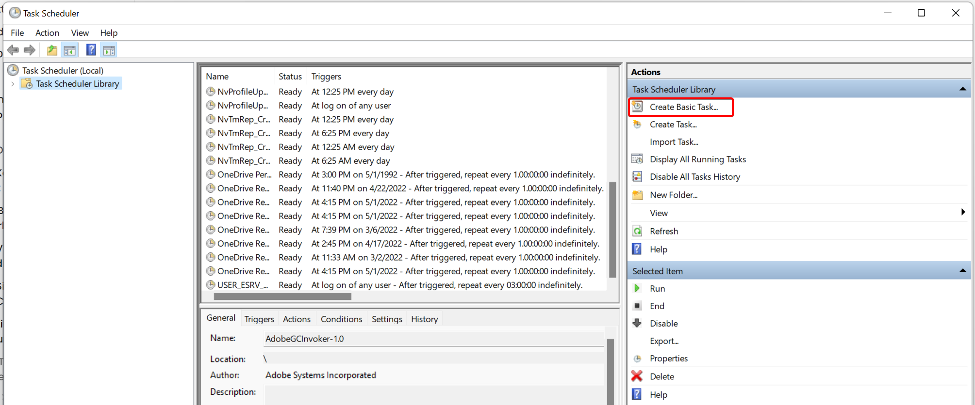 - In the task scheduler application, click on the Create Basic Task option appearing on the right sidebar.
