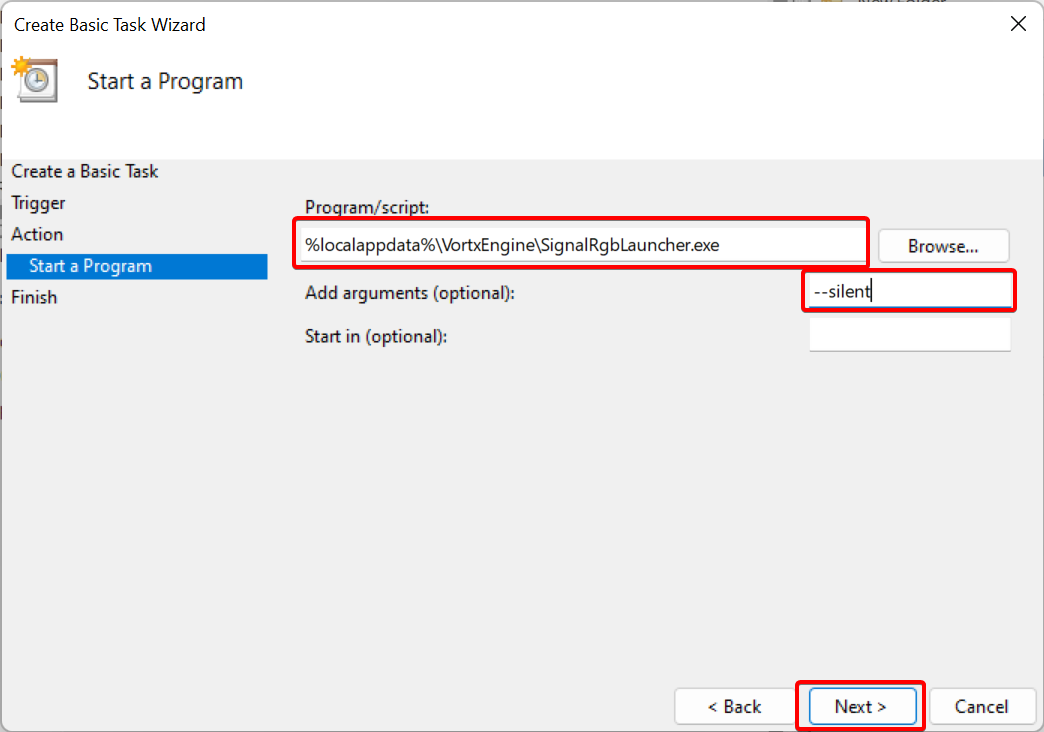 Program/Scriptbox paste the following:%localappdata%\VortxEngine\SignalRgbLauncher.exe. In theAdd argumentsbox, add--silent. Then, click Next.
