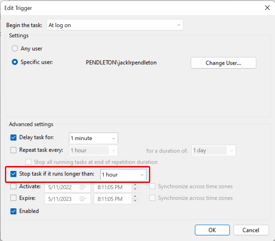 Stop task if it runs longer thanbox and select1 hourin the dropdown. Then, click OK.