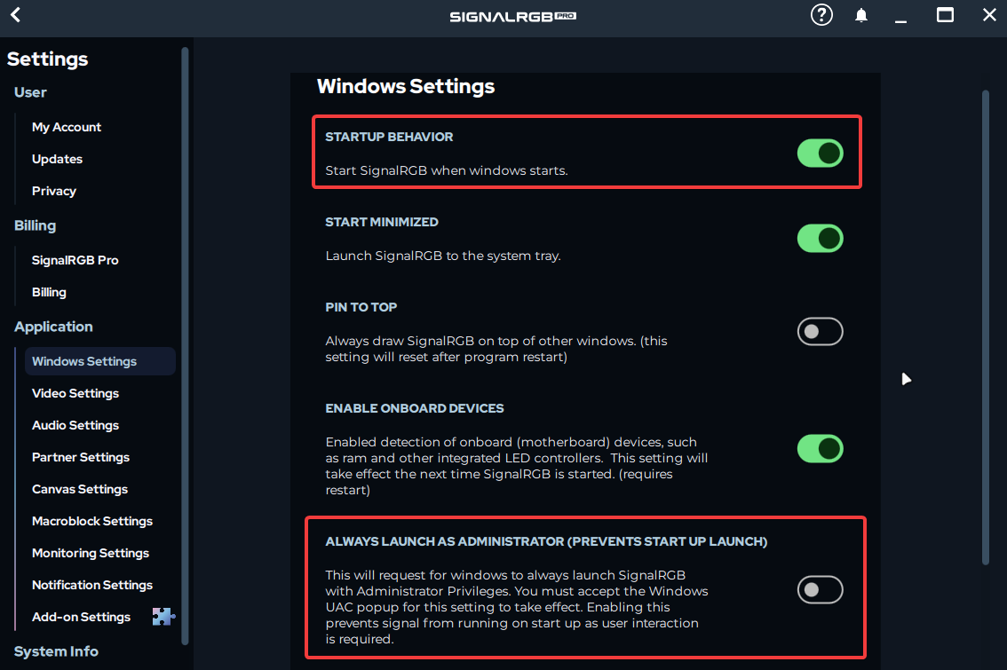 - In SignalRGB go to Settings -> Windows Settings and make sure