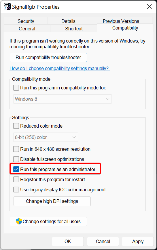 Section titled “Launch as admin”If the built in “Run as Administrator” toggle is not working within SignalRGB, try the method below to make SignalRGB run as administrator on launch.