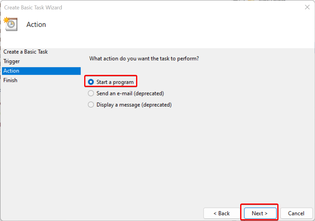 Start a programand click Next.